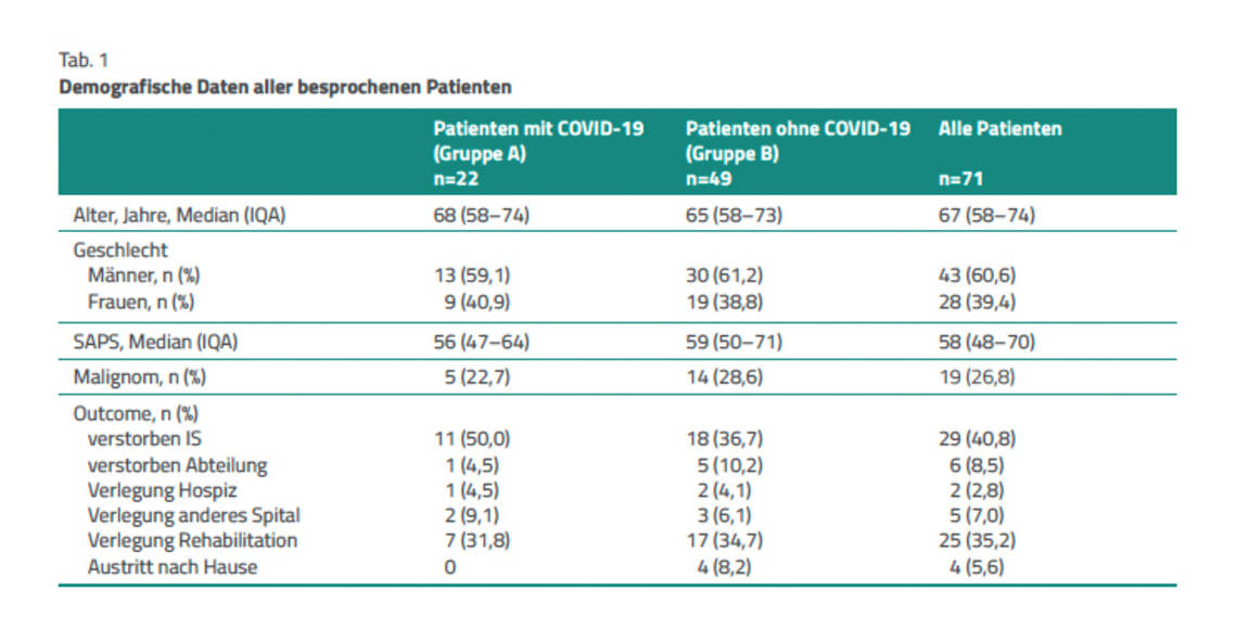 Datensammlung und Auswertung. Aus den elektronischen Patientenakten wurden für alle im Untersuchungszeitraum besprochenen Patienten folgende Parameter erhoben: Alter und Geschlecht, Schweregrad der Erkrankung unter Verwendung des SAPS-II-Scores [11] – Maßzahl für den physiologischen Zustand eines Patienten –, das Vorliegen eines Malignoms und das Outcome.