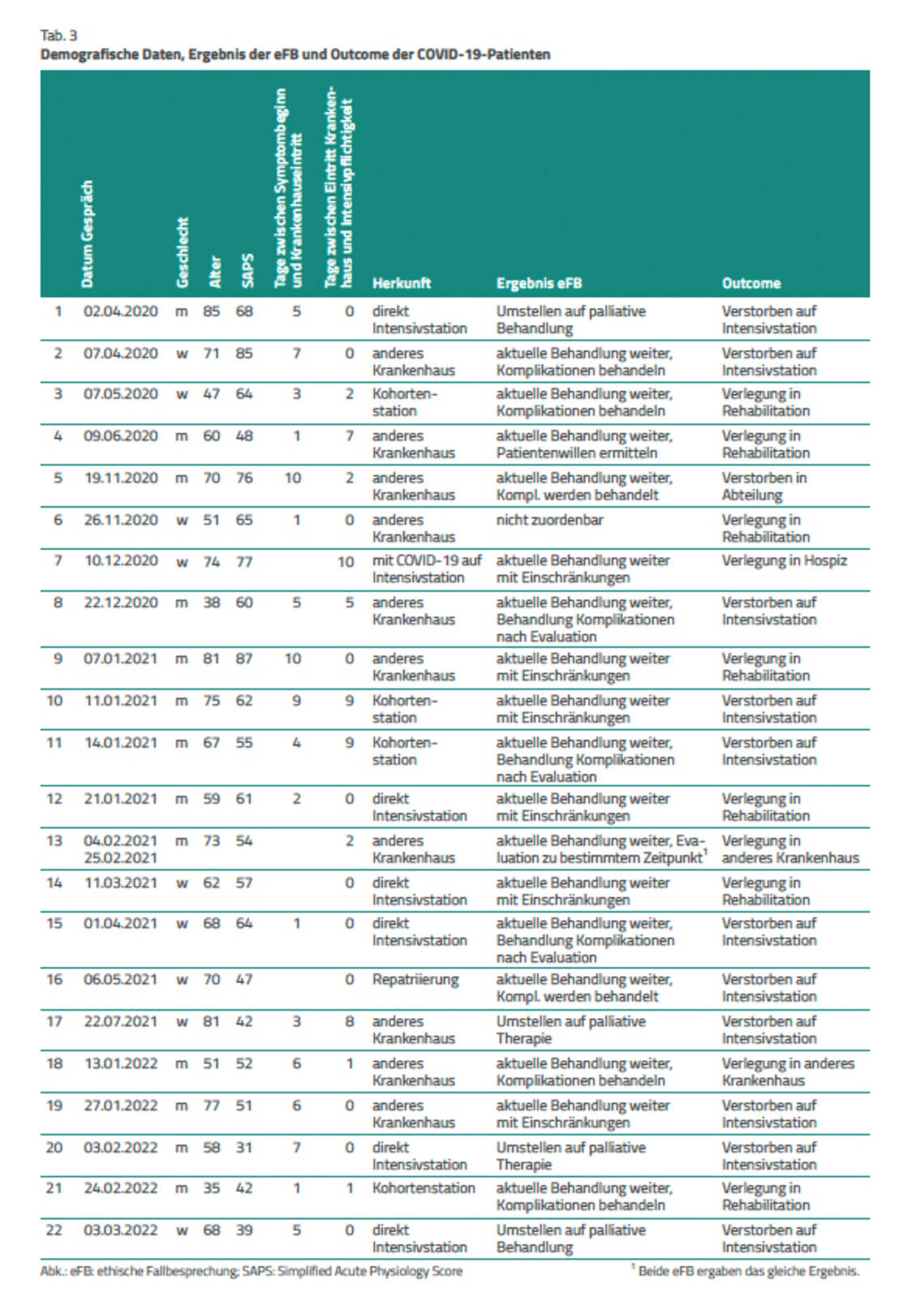 - Die Mortalität von COVID-19-Patienten, zu denen eine eFB erfolgt, ist hoch, obwohl das Ergebnis der Besprechung häufiger eine Fortführung der Therapie inklusive Behandlung potenzieller Komplikation ist.