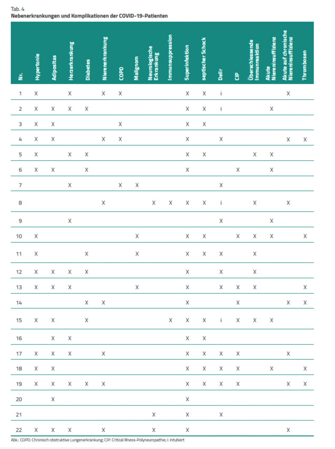 Alle COVID-19-Patienten hatten mindestens eine relevante Nebenerkrankung (Tab. 4). Drei Patienten (13,6 %) hatten nur eine Nebenerkrankung, vier Patienten (18,2 %) wiesen deren zwei und fünf Patienten (22,7 %) drei Nebenerkrankungen auf. Acht Patienten (36,4 %) litten an vier Nebenerkrankungen und zwei weitere (9,1 %) sogar an deren sechs. Am häufigsten waren eine arterielle Hypertonie (15 Patienten, 68,2 %), Adipositas (13 Patienten, 59,1 %) und eine Herzerkrankung (elf Patienten, 50 %) zu beobachten. Andere Nebenerkrankungen waren etwas seltener: Diabetes mellitus (acht Patienten, 36,4 %), eine Nierenerkrankung (sieben Patienten, 31,8 %, ein Malignom oder eine COPD (je vier Patienten, 18,2 %), eine neurologische Erkrankung (drei Patienten, 13,6 %) und eine Immunsuppression (zwei Patienten, 9,1 %).