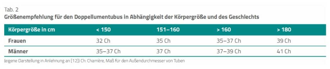 Zur Atemwegssicherung und anschließenden ELV stehen unterschiedliche Doppellumentuben in verschiedenen Größen zur Auswahl, die in Abhängigkeit zu Körpergröße und Geschlecht des Patienten auszuwählen sind (Tab. 2).