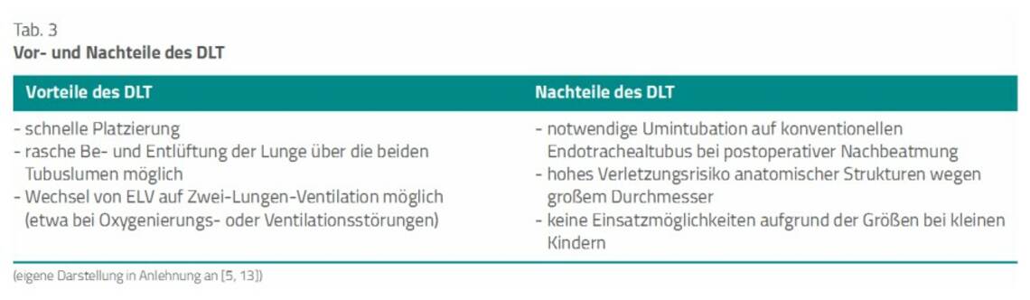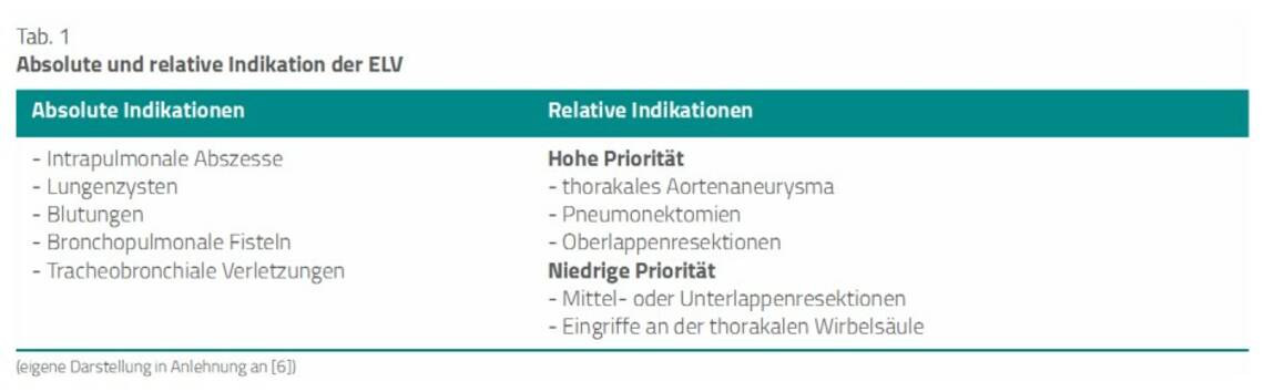 Ein fester Bestandteil ist in diesem Kontext die Anwendung der Ein-Lungen-Ventilation (ELV). Dabei werden linker und rechter Lungenflügel funktionell durch den Einsatz spezieller Doppellumentuben sowie moderner Medizintechnik voneinander getrennt. Dieses anästhesiologische Verfahren übernimmt nach entsprechender ärztlicher Indikationsstellung (Tab 1.)