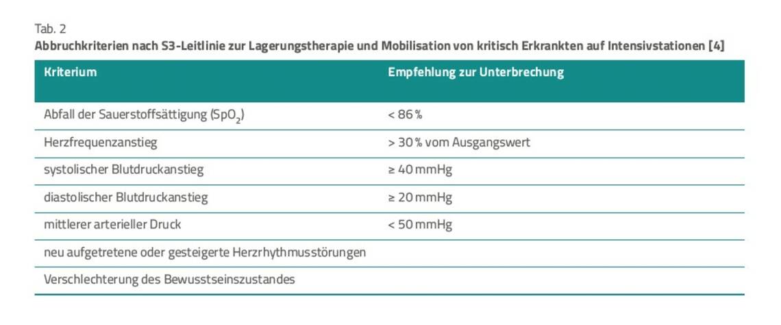 Die Leitlinienautorinnen und -autoren können keine evidenzbasierte Empfehlung zu absoluten Werten als Kontraindikation für Mobilisation abgeben. Allerdings ist eine Mobilisierung zu pausieren oder abzubrechen, wenn es nach klinischer Einschätzung zu einer Gefährdung der Patienten kommt. Die Kriterien dazu sind in Tabelle 2 ersichtlich.