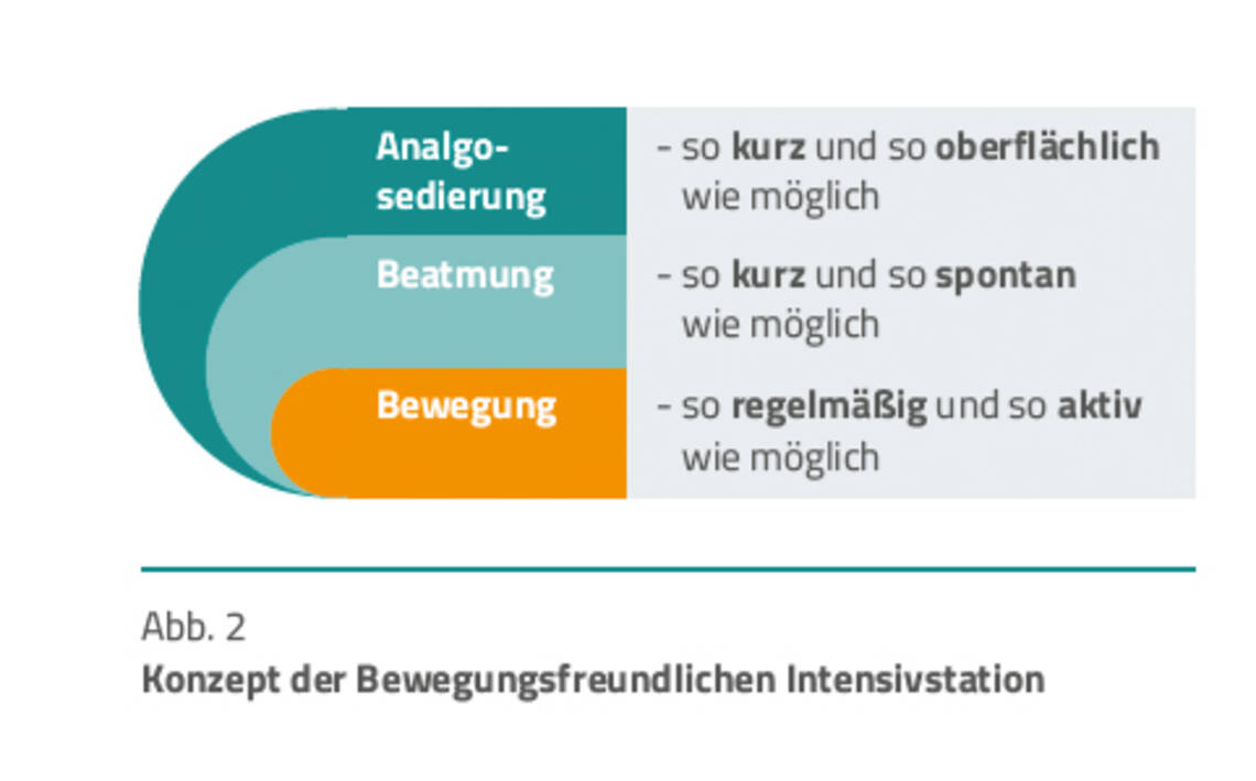 Eine Voraussetzung ist, intensivmedizinische Maßnahmen (zum Beispiel Beatmung oder Sedierung, aber auch Katheter oder Fixierungen) so gering wie möglich einzusetzen, sodass die negativen Folgekomplikationen in Form eines Post-Intensive-Care-Syndroms möglichst vermeidbar sind. Im sogenannten ABCDEF-Bundle sind alle wesentlichen Abläufe aufgeführt, um das Konzept einer bewegungsfreundlichen Intensivstation interprofessionell umsetzen zu können [8]. Die einzelnen Buchstaben beschreiben die jeweiligen Teilbereiche: