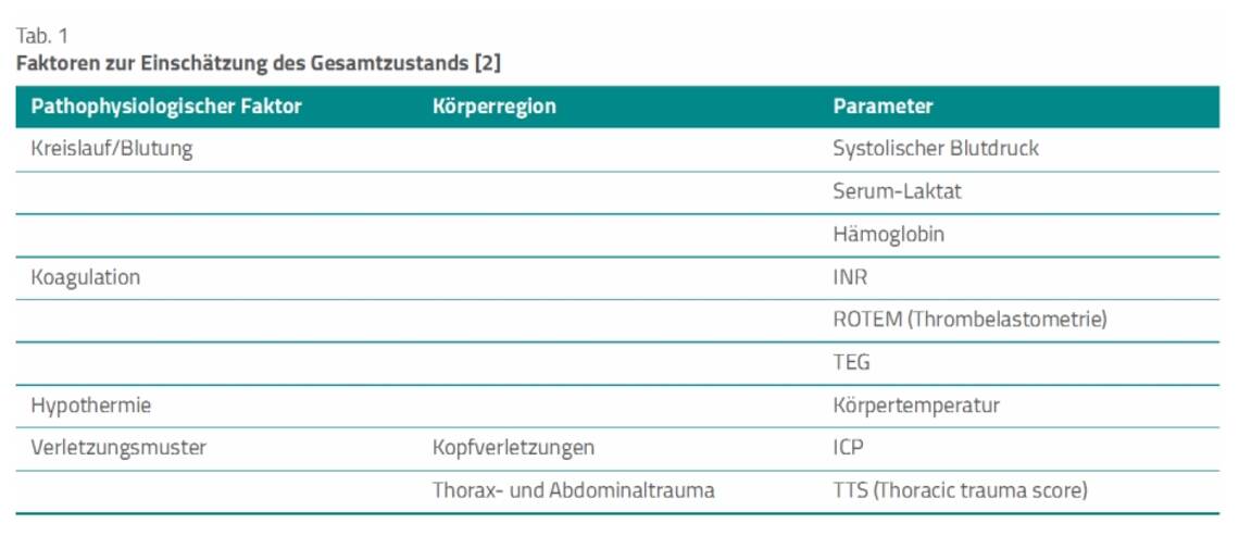 Die Leitlinienautoren verweisen außerdem auf die traumainduzierte Koagulopathie als eigenständiges Krankheitsbild, das einen deutlichen Einfluss auf das Überleben hat, sodass Gerinnungsdiagnostik und Therapie spätestens im Schockraum beginnen sollen. Die Leitlinie verweist für Einzelheiten auf die „Querschnitts-Leitlinien zur Therapie mit Blutkomponenten und Plasmaderivaten“ [12].