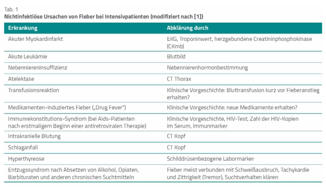 Fieber ist nicht immer gleichzusetzen mit einer Infektion und schon gar nicht in jedem Fall mit einer bakteriellen Infektion. Der Reflex, bei Fieber sofort zu einem Antibiotikum zu greifen, ist nach Auffassung der Autoren der Leitlinie – erstellt von der US-amerikanischen Gesellschaft für Intensivmedizin (Society of Critical Care Medicine, SCC) in Zusammenarbeit mit der Infektiologen-Gesellschaft (Infectious Diseases Society of America, IDSA) – kritisch zu hinterfragen. Die Autoren stellen daher in einer Übersichtstabelle zunächst mögliche nichtinfektiöse Ursachen von Fieber zusammen (Tab. 1). Diese sind mittels Anamnese, körperlicher Untersuchung, gegebenenfalls Laboruntersuchungen, Röntgendiagnostik und patientennaher Ultraschalluntersuchung abzuklären [1].