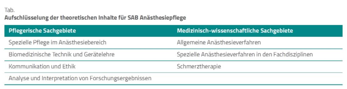 Die SAB setzt sich sowohl aus fachspezifischen Praktika wie auch aus theoretischen Inhalten zusammen, wobei das Verhältnis zwischen Theorie und Praxis je nach Ausbildungseinrichtung und -dauer variieren kann. Die theoretischen Inhalte sind ferner in pflegerische und medizinisch-wissenschaftliche Sachgebiete gegliedert (Tab.) [8]. Die Inhalte der SAB hat der Gesetzgeber lediglich als Mindestanforderung definiert. Die Differenz zwischen diesem Minimum und den übrigen Stunden, die nötig sind, um zumindest 60 ECTS für einen ULG zu erfüllen, ermöglicht es den Ausbildungsstätten überdies, fachliche Schwerpunkte zu setzen, beispielsweise im Schmerz- oder Notfallmanagement.