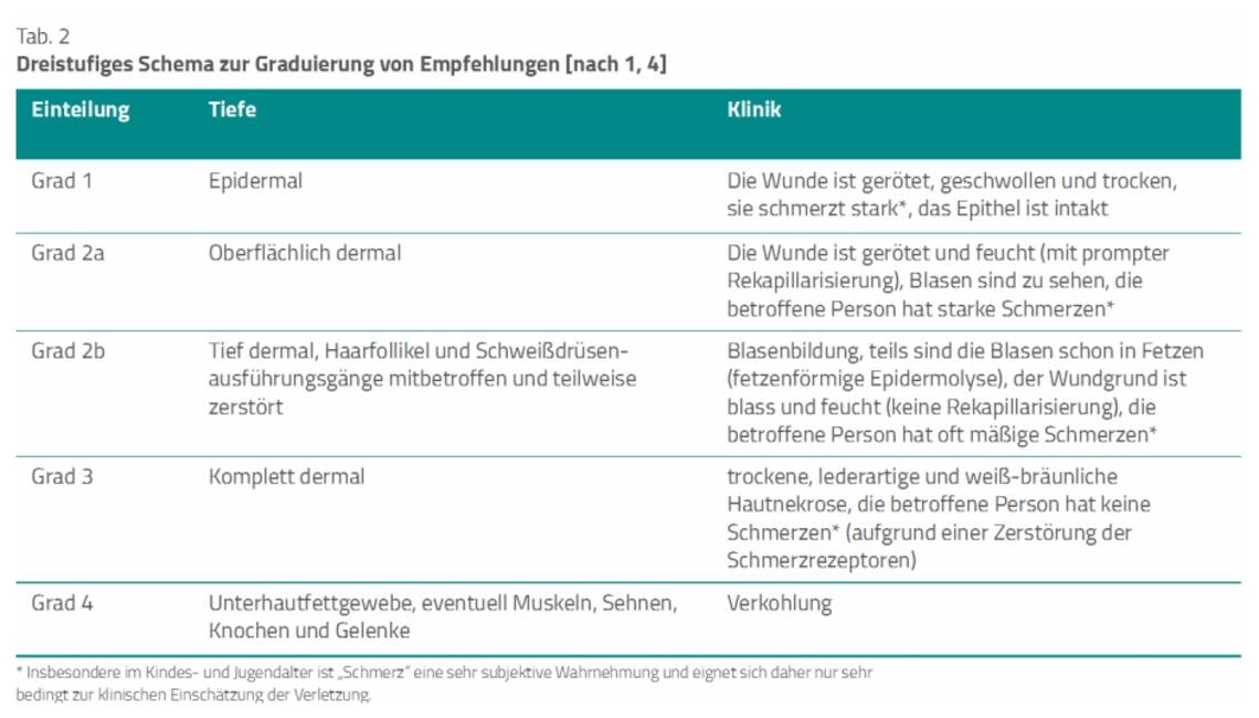 Die Verbrennungstiefe bezieht sich auf die betroffenen Hautschichten und wird in vier Graden angegeben (Tab. 2) [1]. Der zweite Grad wird zusätzlich unterteilt in oberflächlich zweitgradig (2a) und tief zweitgradig (2b).