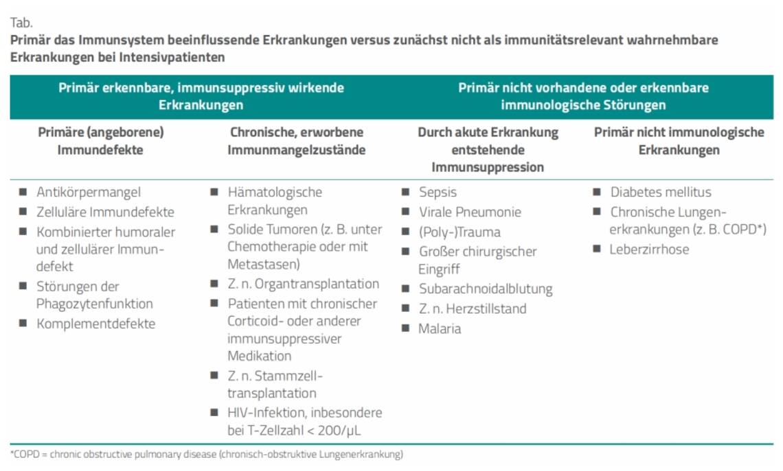 Die Studienautoren unterscheiden zwei grundsätzlich verschiedene Arten von immunsuppressiven Erkrankungen auf der Intensivstation (Tab.):