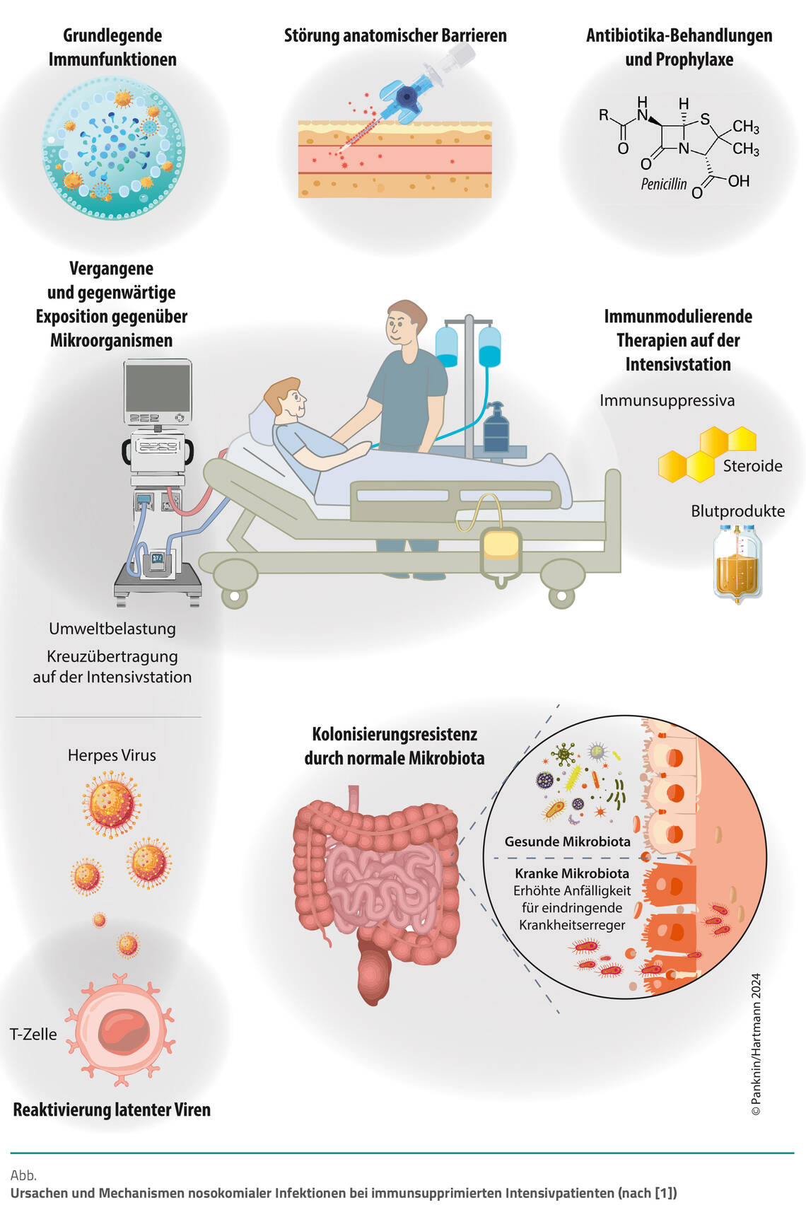 Immunsupprimierte Patienten sind auf der Intensivstation einem deutlich höheren Risiko ausgesetzt, eine nosokomiale Infektion durch Bakterien, Viren sowie Pilze zu erleiden, als immungesunde Patienten. Die Abbildung zeigt die Ursachen und Mechanismen, die dabei eine Rolle spielen.