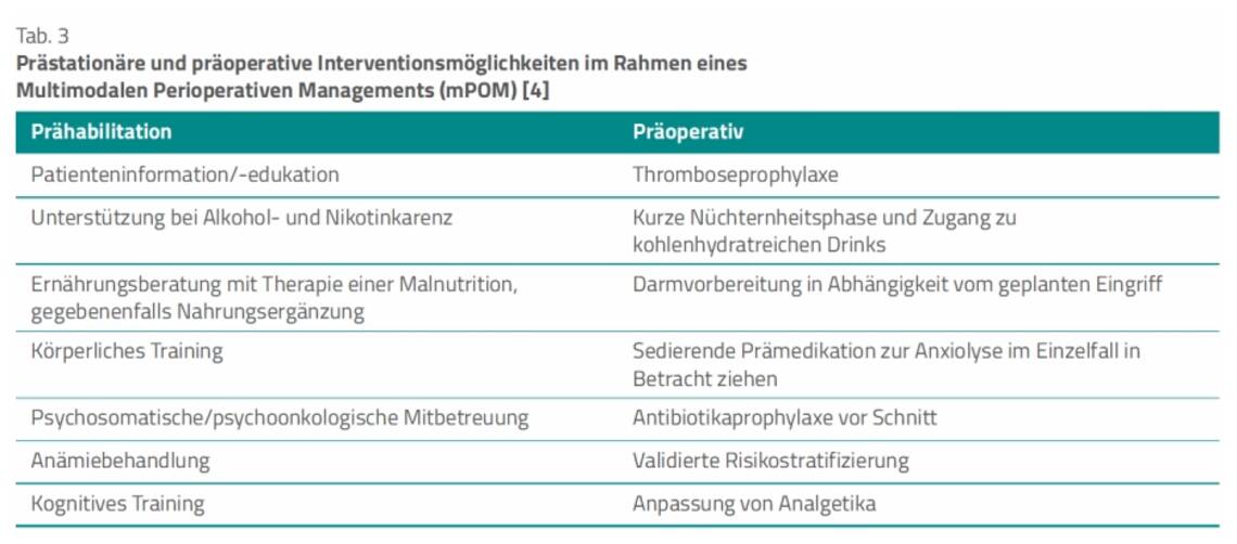 Wichtig zu wissen: Als Standardmaßnahmen vor jeder Operation empfehlen die Autoren Interventionen wie ausgewogene Ernährung, Alkohol- und Nikotinkarenz sowie körperliche Aktivität (Tab. 3) [4].