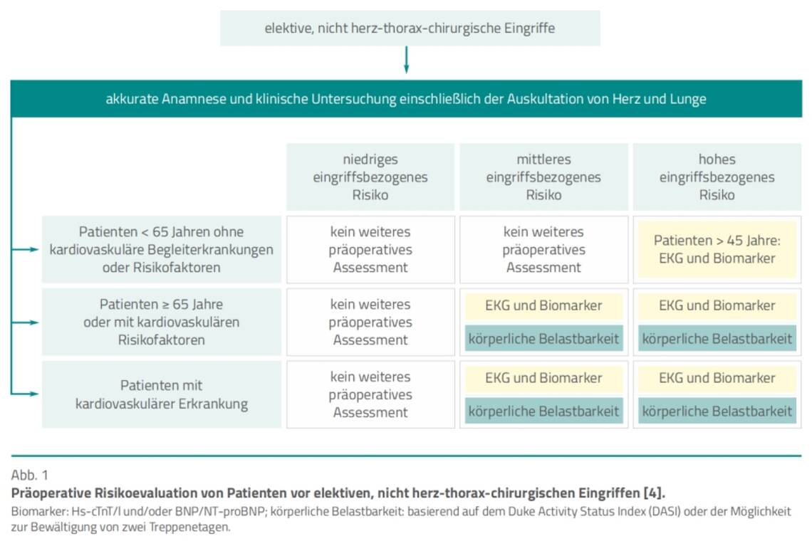 Dabei sind das patientenbezogene Risiko und das eingriffsbezogene Risiko gemeinsam zu betrachten. So kann bei einem Patienten mit kardiovaskulären Risikofaktoren und einem niedrigen eingriffsbezogenen Risiko kein weiteres präoperatives Assessment erforderlich sein, wohingegen bei dem gleichen Patienten weitere Untersuchungen notwendig sind, wenn das eingriffsbezogene Risiko als mittel oder hoch eingestuft ist.
