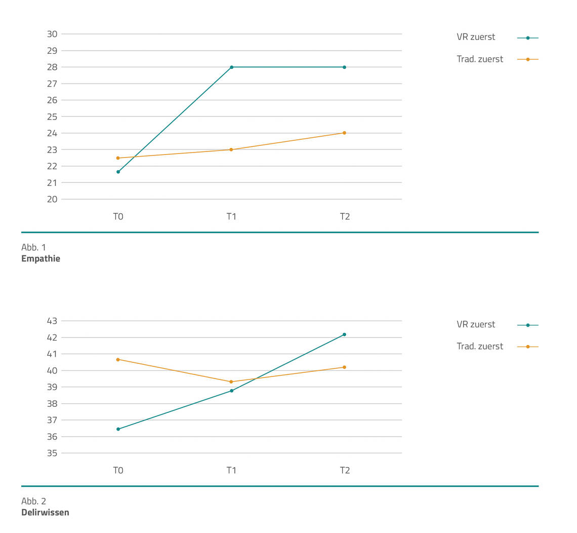 Wissenszuwachs. Auch das Fachwissen über Delir stieg insgesamt an. Allerdings zeigte sich kein klarer Vorteil der VR-Methode gegenüber der klassischen Schulung. Eine interessante Beobachtung: Erfolgte zuerst die VR-Schulung, war der Wissenszuwachs größer – möglicherweise, weil das emotionale Erleben die anschließende Informationsverarbeitung vertiefte (Abb. 2).