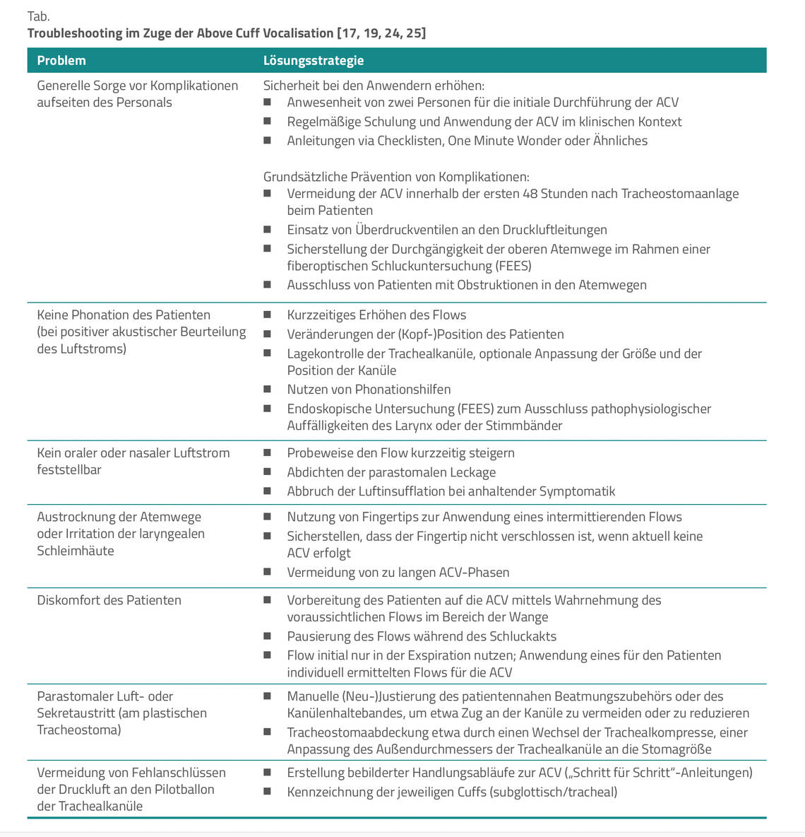 Die „Above Cuff Vocalisation“ (ACV) ist ein Verfahren, um Patienten mit geblockter Trachealkanüle temporär das Sprechen zu ermöglichen. Die Literatur beschreibt die Anwendung der ACV bei einer Vielzahl von Patienten – nahezu unabhängig von der Grunderkrankung. Kontraindiziert ist sie lediglich bei Patienten mit Stenosen oder Schwellungen der oberen Atemwege, etwa nach Hals-Nasen-Ohren-Eingriffen [12].