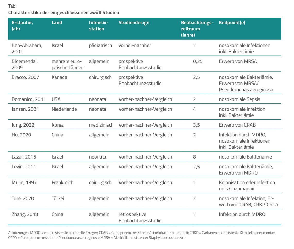 Nach Durchsicht der Kurzzusammenfassungen von 7.578 Publikationen wählten die chinesischen Autoren 25 für die Volltextanalyse aus, von denen zwölf den genannten Kriterien genügten. Das Publikationsjahr, das Herkunftsland der Studie, die Art der Intensivstation, der Studientyp und der jeweils gewählte Endpunkt sind der Tabelle zu entnehmen.