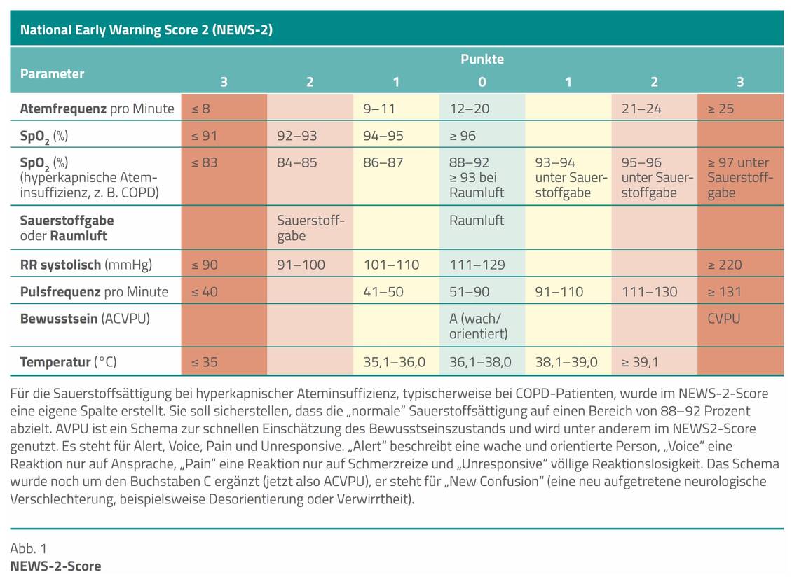NEWS-2-Score. Die höchste Sensitivität besitzt aktuell der NEWS-2-Score, eine angepasste, verbesserte Version, die gegenüber der Ursprungsversion zu bevorzugen ist (Abb. 1 und 2). Er wurde vom Royal College of Physicians im Vereinigten Königreich eingeführt. Bei Patienten, die jünger als 16 Jahre sind, oder bei Schwangeren soll der Score nicht verwendet werden. Er kann sowohl in der prähospitalen Umgebung, der Notaufnahme und im stationären Bereich Anwendung finden. Von den häufig verwendeten Sepsis-Screeningtools deckt er die meisten Parameter ab [1].