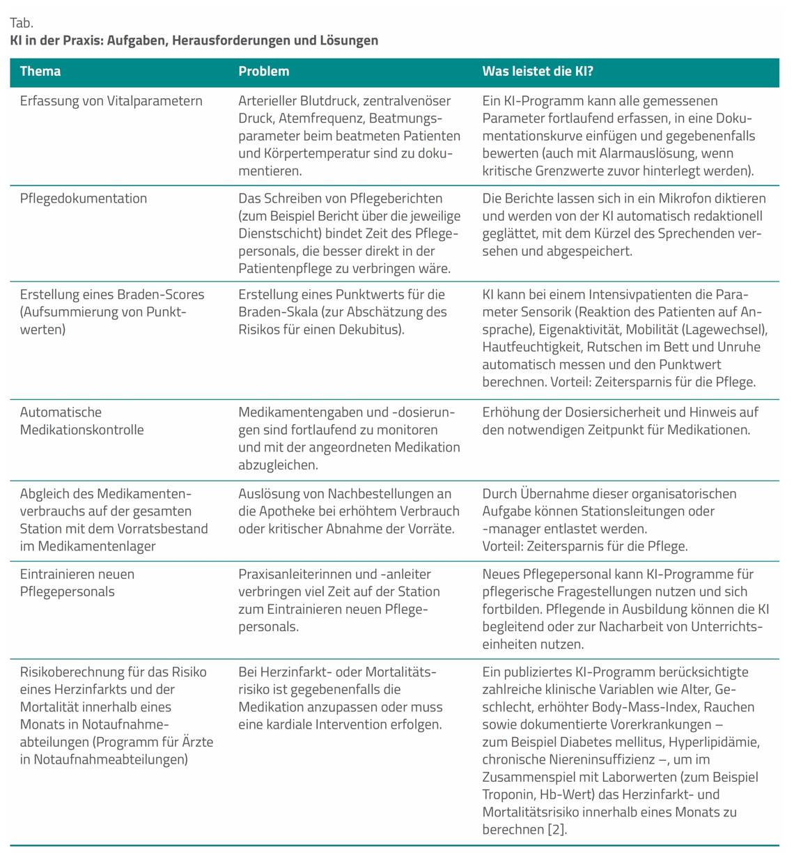 Die Tabelle gibt einige Beispiele, wie die KI gemäß der Studien in der Intensivpflege oder in einer Notaufnahme sinnvoll zum Patientenmanagement beitragen konnte. Das in der untersten Tabellenzeile dargestellte KI-Programm ist eher ein Beispiel für die Nutzung durch Ärzte. Die übrigen Programme konnten für Pflegende eine Zeitentlastung schaffen.