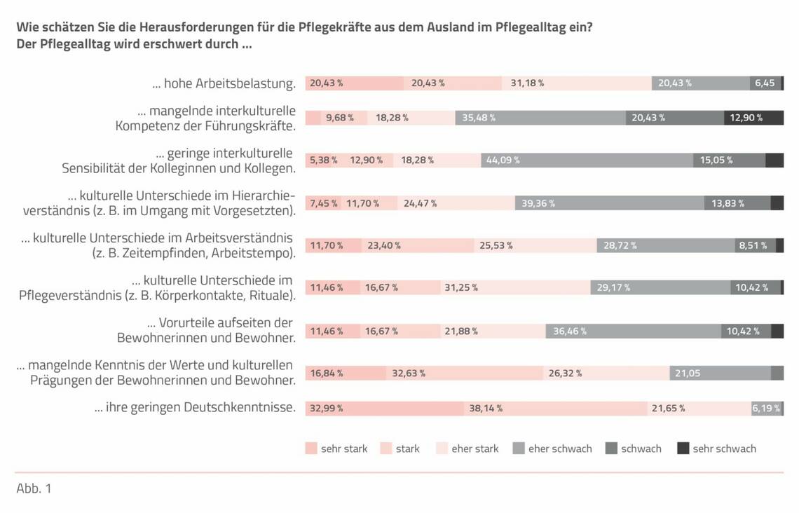 Allerdings erkennen 90 % der Befragten eine eher starke bis sehr starke Herausforderung in mangelnden Deutschkenntnissen. Als weitere Herausforderungen gelten das Pflege- und das Berufsverständnis, die Kommunikation mit Angehörigen bzw. innerhalb des Teams sowie die Arbeitsorganisation (Abb. 2).