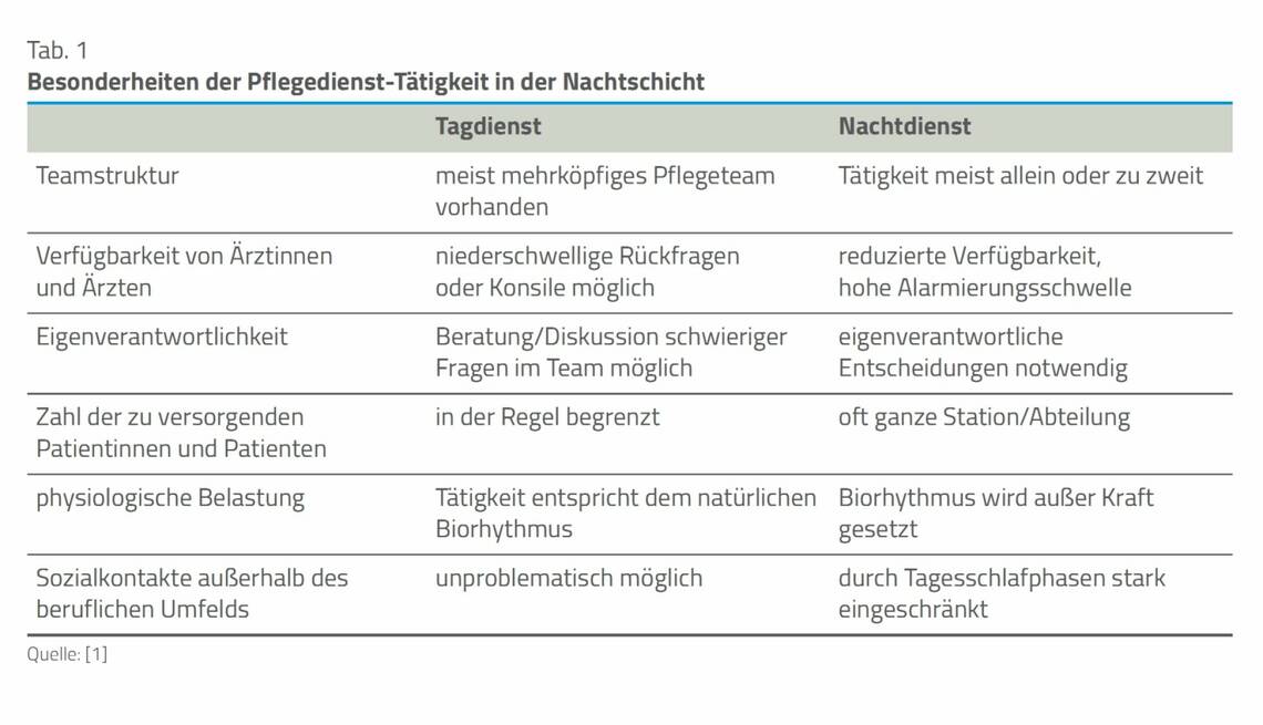 Nachtdienst in der Pflege wird unterschiedlich organisiert. Es existiert sowohl das Modell, dass mehrere Beschäftigte einzelne oder eine kurze Serie von Nachtdiensten übernehmen, als auch die Option, dass eine Pflegeperson aus eigener Entscheidung heraus als sogenannte Dauernachtwache arbeitet. In beiden Fällen entstehen durch die Tätigkeit nachts deutlich andere Belastungen als im Tagdienst. Einige wesentliche Unterschiede sind in Tabelle 1 zusammengefasst.
