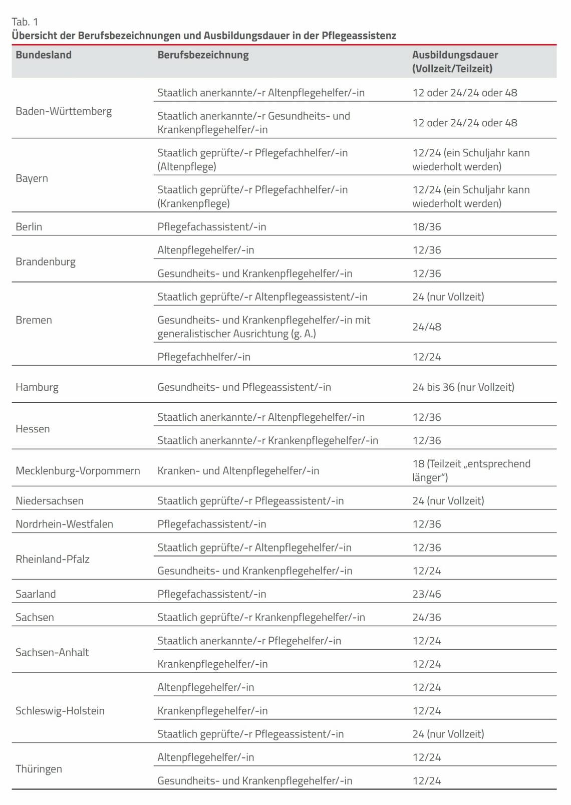 Mit der zweiten Auflage der Broschüre „Pflegehilfe und Pflegeassistenz“ hat das Bundesinstitut für Berufsbildung (BIBB) einen erneuten Vergleich der verschiedenen landesrechtlichen Regelungen zur Ausbildung und Berufsausübung in der Pflegeassistenz vorgelegt [1]. Die Analyse zeigt: Aktuell existieren bundesweit 27 verschiedene Ausbildungsmöglichkeiten in der Pflegeassistenz (Tab. 1). Die Heterogenität spielt sich auf allen erdenklichen Ebenen ab: beginnend bei der Berufsbezeichnung über die Ausbildungsdauer, die Art des Abschlusses, die Ausbildungsinhalte bis hin zu den zuständigen Ressorts der Landesregierungen. Historisch gewachsen und ins jeweilige System eingefügt, zeigt sich damit eine Vielfalt, die kaum noch jemand durchblickt. Zusätzlich bestehen zum Teil nebeneinander in verschiedenen Bundesländern noch die Helferqualifikationen nach altem Recht – die sogenannte Alten- oder Krankenpflegehilfe – und die neuen generalistisch ausgerichteten Ausbildungen, die sich mehr oder weniger deutlich an der neuen Ausbildung nach dem Pflegeberufegesetz (PflBG) orientieren. Im Resultat existieren unterschiedliche Berufsbilder, deren Aufgabenbereiche nicht eindeutig definiert sind. Im Folgenden ist einheitlich von Pflegeassistenz die Rede, womit alle Qualifikationen in der Pflege gemeint sind, die mindestens einjährig und auf dem Qualifikationsniveau 3 angesiedelt sind.