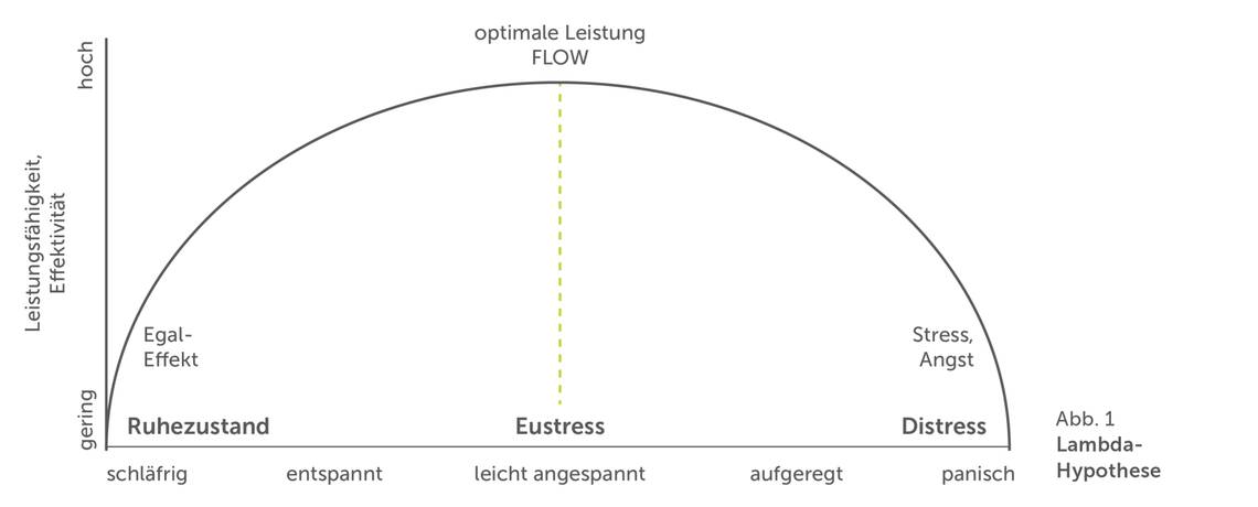 Zunächst ist es wichtig, sich dem Zusammenhang zwischen dem Grad der Aktivierung mit dem Grad der Leistungsfähigkeit bewusst zu werden. Die Lambda-Hypothese (Abb. 1) ist für dieses Verständnis hilfreich: Demnach schränkt sowohl eine zu geringe Aktivierung (Langeweile) als auch eine zu hohe Aktivierung (Stress, Angst) die Leistungsfähigkeit ein [1]. Für Lehrende und Praxisanleitende ist es daher wichtig, sowohl Unter- als auch Überaktivierung zu erkennen, um Auszubildende gezielt entweder zu aktivieren oder „herunterzuholen“. So können sie die Leistungsfähigkeit der angehenden Pflegefachpersonen gezielt erhöhen und damit Lernprozesse unterstützen.